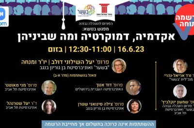 ה-16.6.23 בשעות 12:30-11:00, בזום יו"ר ומנחה: פרופ' יעל השילוני דולבעל רקע המאבק על דמותה וערכיה של מדינת ישראל כמדינה דמוקרטית נקיים דיון בשאלת קשרי הגומלין שבין דמוקרטיה ליברלית לבין שדה הפעולה והאתוס של האקדמיה.בין היתר נשאל:• האמנם אין אק
