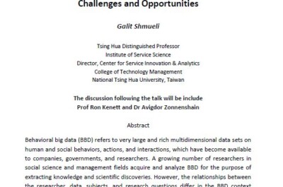 מצגת אורח מיוחדת ואחריה דיוןיום שלישי, 29/5/2018 @ 10:30אולם בטלר, הטכניון מחקר התנהגותי מרובה נתונים בנושא בריאות:אתגרים והזדמנויות גלית שמואלי