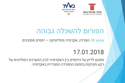 מפגש הפורום להשכלה גבוהה מס' 38 – 17.1.18 מפגש בנושא: הפרדה, אקדמיה ופוליטיקה – יחסים מסוכנים פרופ' חנוך גוטפרוינד, היו"ר היוצא של עמותת "בשער"מר יוחנן פלסנר, נשיא המכון הישראלי לדמוקרטיהפרופ' זאב תדמור, יו"ר מוסד שמואל נאמן למחקר מדיניות לאומית