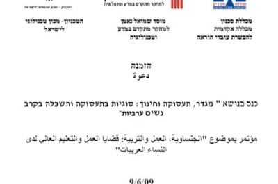 מכללת סכנין להכשרת עובדי הוראה, מוסד נאמן והטכניון מתכבדים להזמינך לכנס בנושא "מגדר, תעסוקה וחינוך: סוגיות בתעסוקה והשכלה בקרב נשים ערביות" אשר ייערך ביום שלישי 9/6/09 , י"ז בסיון תשס"ט באודיטוריום בטלר בטכניון. תוכנית הכנס 9:0