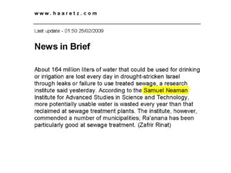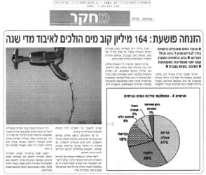 כ 164,000,000 ליטרים של מים שיכול לשמש לשתייה או להשקיה הולכים לאיבוד מדי יום בישראל מוכת הבצורת באמצעות הדלפות או אי שימוש במי ביוב מטופלים.